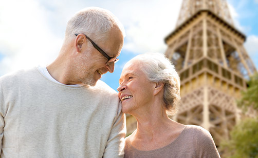 A happy, good-looking senior couple looking at each other and smiling